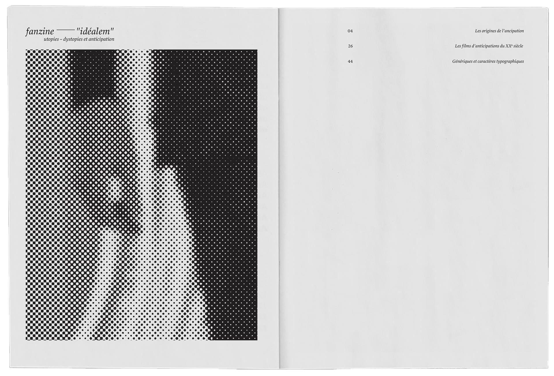 IDEALEM est mon projet de licence. C'est un fanzine qui traite des films d'anticipations. Le traitement d'image rappelle les techniques d'impressions des affiches de cinéma.